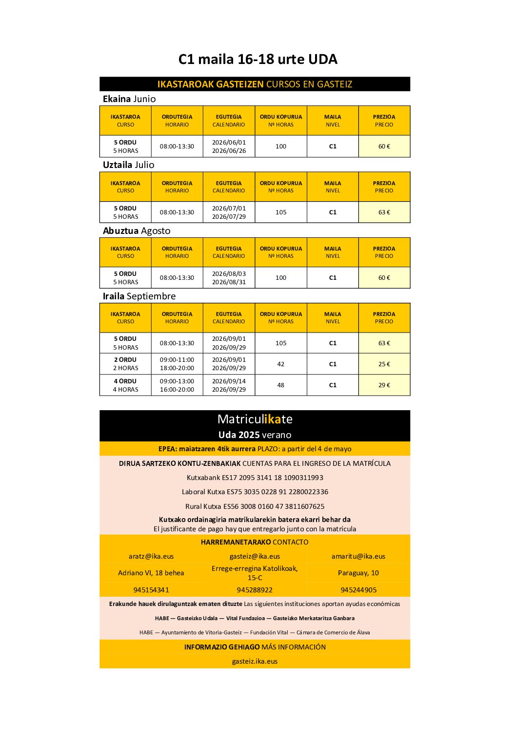 16 eta 18 urte bitartean badituzu, C1 mailako ikastaroa oso merke aterako zaizu.